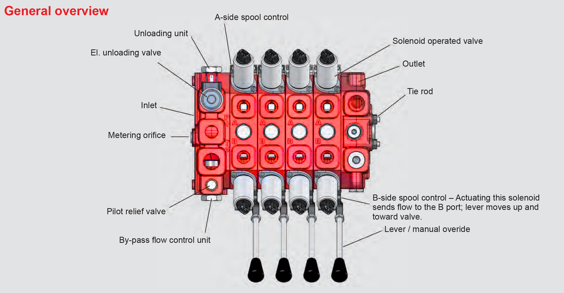 RS 220 is a sectional open center valve designed for max. operating pressures up to 4,350 psi (300 bar) and max. pump flows up to 30 gpm (110 Lpm). It is available with 1 to 10 working sections per valve assembly. RS 220 is designed with an open center for fixed pumps and a restricted open center for variable displacement pumps. It is available with electro-hydraulic or hydraulic proportional remote control, but the valve can also be manually operated.